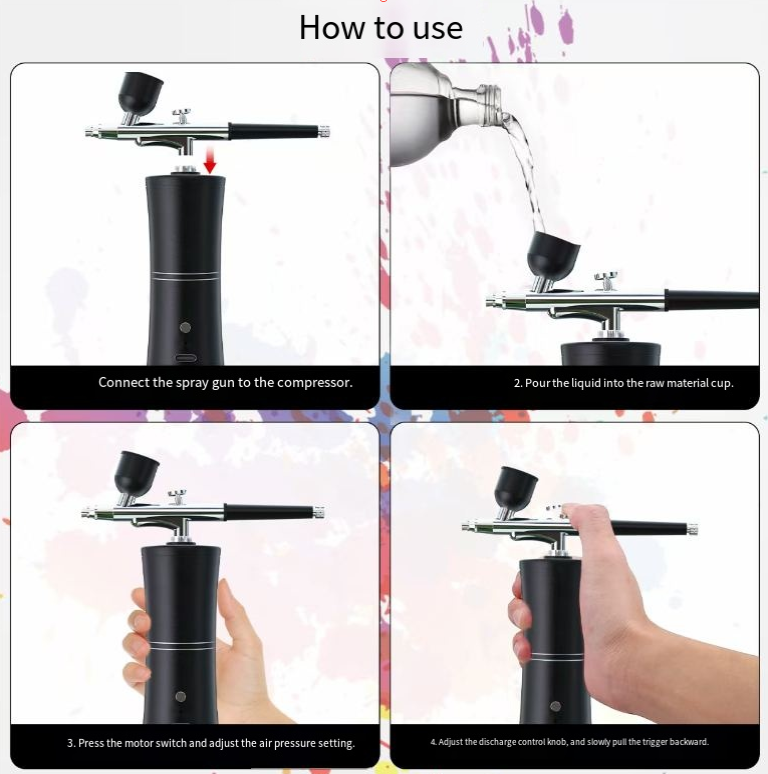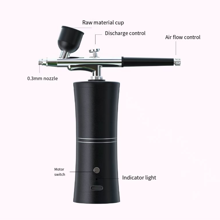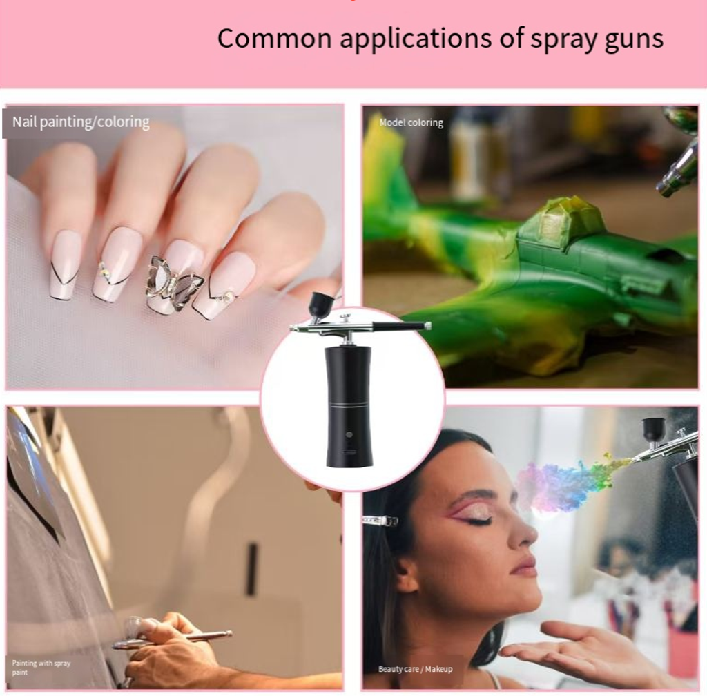 Equipped with a 0.3mm precision nozzle and a powerful air pump, it outputs stable high-pressure air flow, which atomizes the paint, nail polish glue or edible color into fine mist, evenly covering the surface of nails, models or cakes. Gradual blending, transitional colors, and local spraying can all be easily achieved. Say goodbye to brush marks and uneven color blocks, making the creation more exquisite.Are you still frustrated by uneven brush strokes and low efficiency when doing nail polish gradient shading, model coloring, or cake frosting? This portable charging spray pen gun, with its core features of wireless lithium battery, fine atomization, and multi-scenario compatibility, has become a versatile tool for nail artists, model players, baking enthusiasts, and art creators, making every creation precise and efficient, and saying goodbye to cumbersome manual operations.