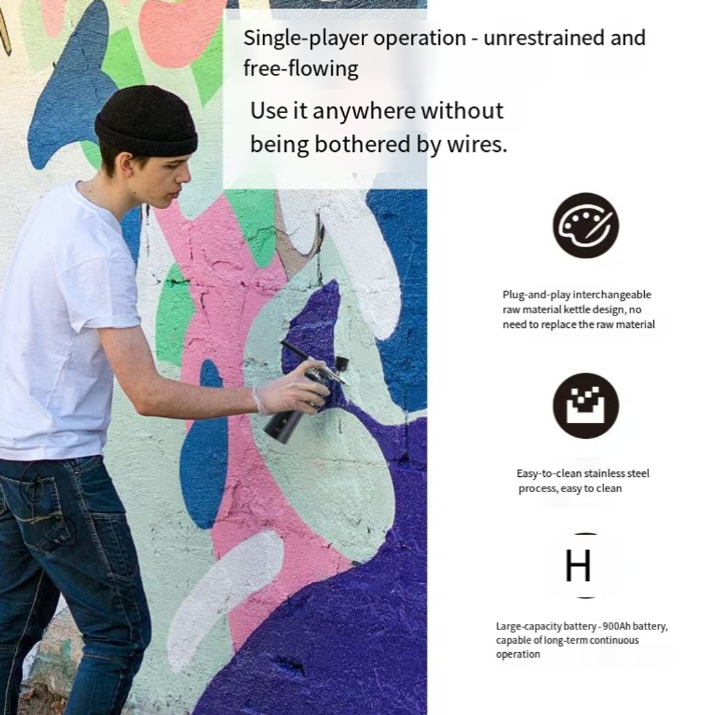 It is equipped with a large-capacity lithium battery and a Type-C interface fast charging design. It frees you from the constraints of power cords and air pumps, truly realizing "wherever you need to create, bring it there". Whether it's a nail salon workstation, outdoor wall painting, model studio, or baking kitchen, you can start spraying work at any time, allowing creativity to be unrestricted.