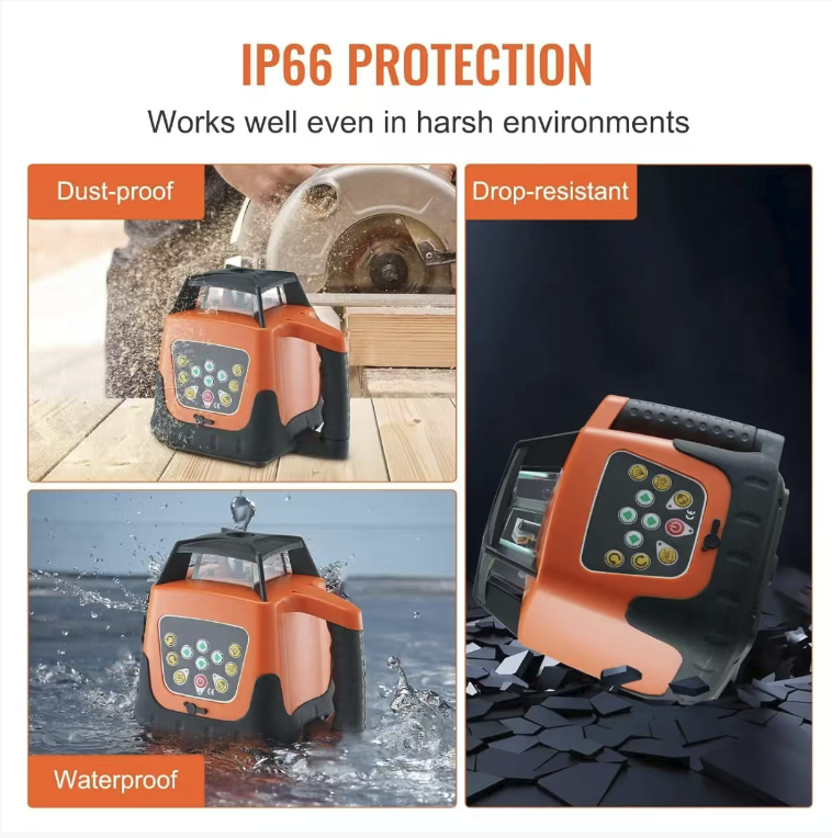 This red laser leveler features 360° full-range coverage and IP66-level military-grade protection. When paired with the receiver, it enables remote operation up to 2000 feet. It supports 360° full-range scanning and multiple directional modes. It is dust-proof, water-resistant, shock-resistant, and can be remotely controlled from 65 feet away. It is a professional and precise tool for laying floor tiles, leveling the ground, and pulling ground wires.