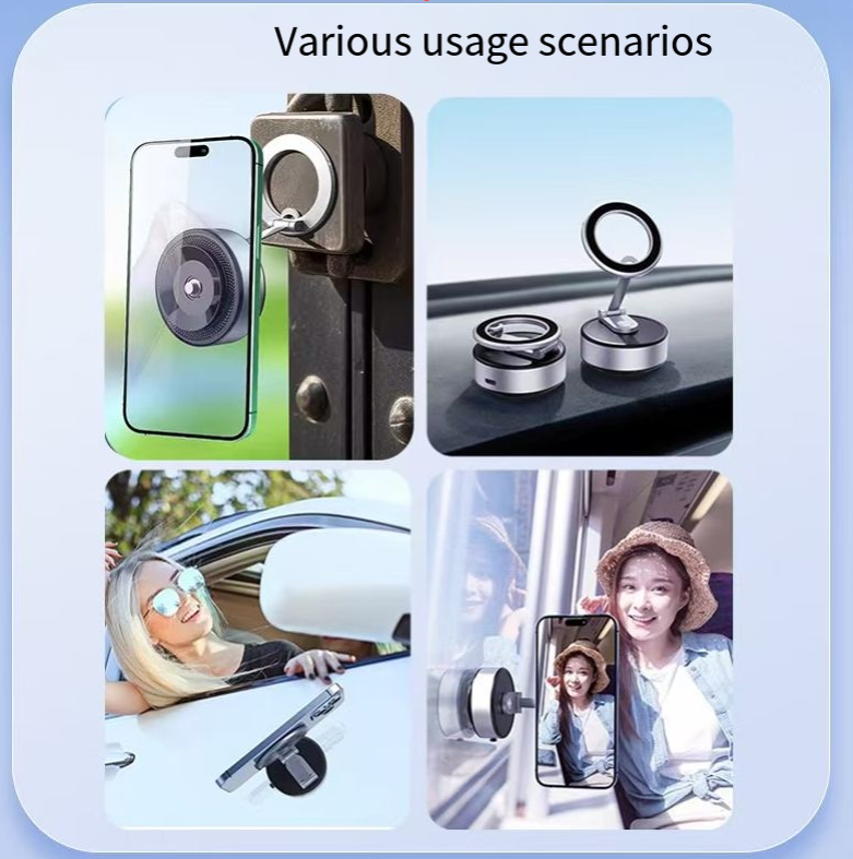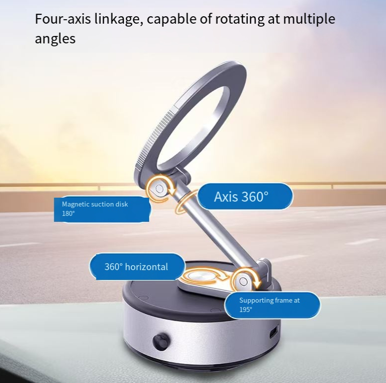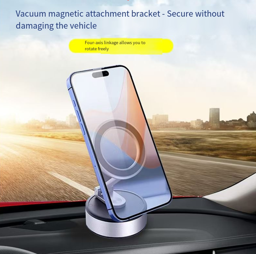 This zinc alloy magnetic support: With a 25KG vacuum suction that is as stable as a rock, it features four-axis linkage for 360° rotation and free angle adjustment. It can be magnetically attached and detached, folded for portability. The zinc alloy material is durable and sturdy. It is suitable for all scenarios such as in vehicles, on desks, or during business trips. Once placed, it will remain stable, eliminating screen shaking and residue from past attachments.