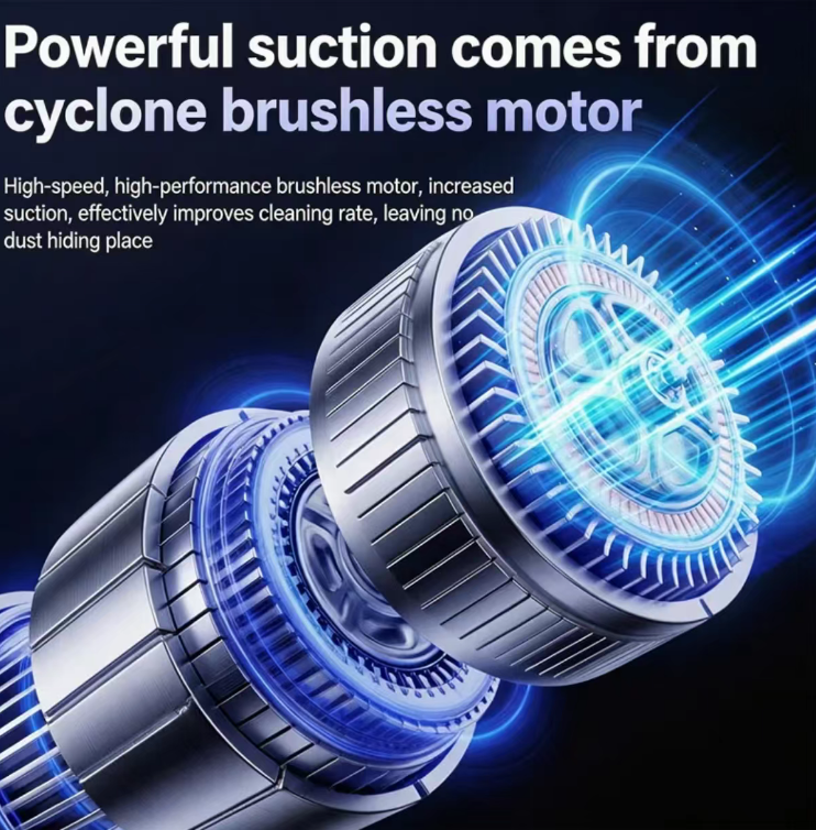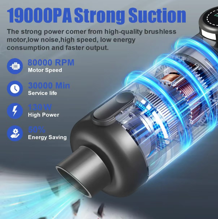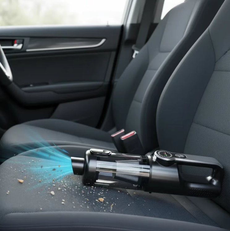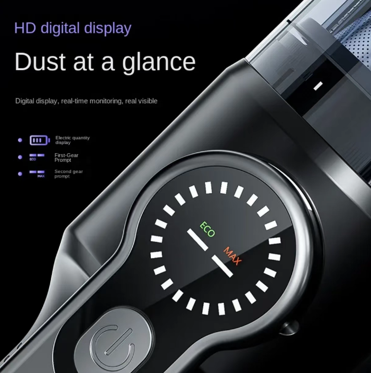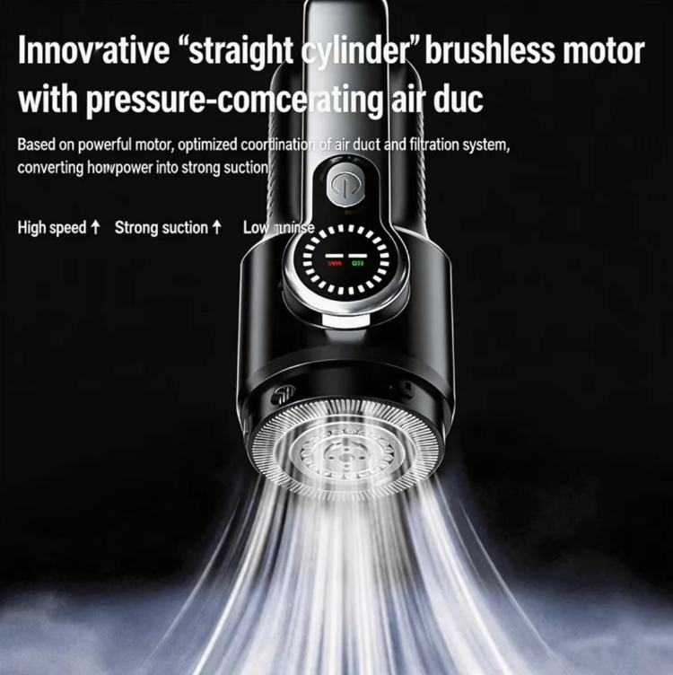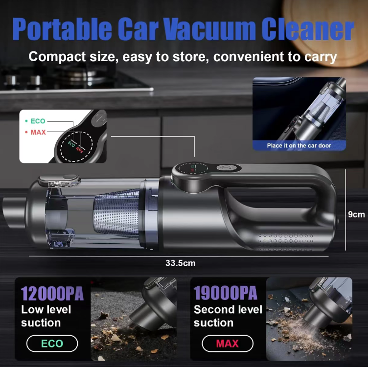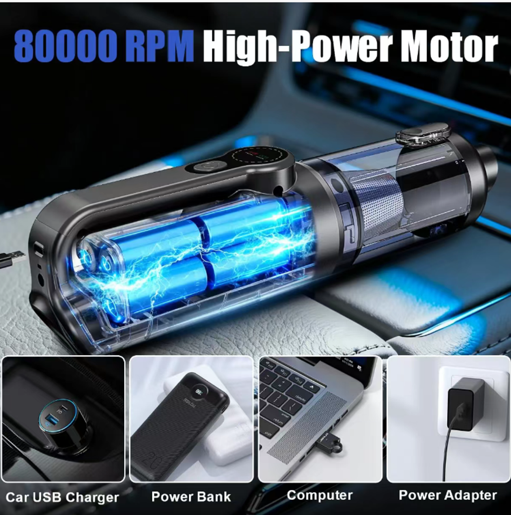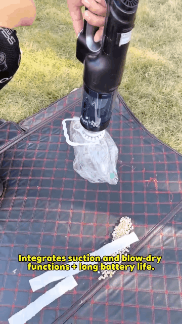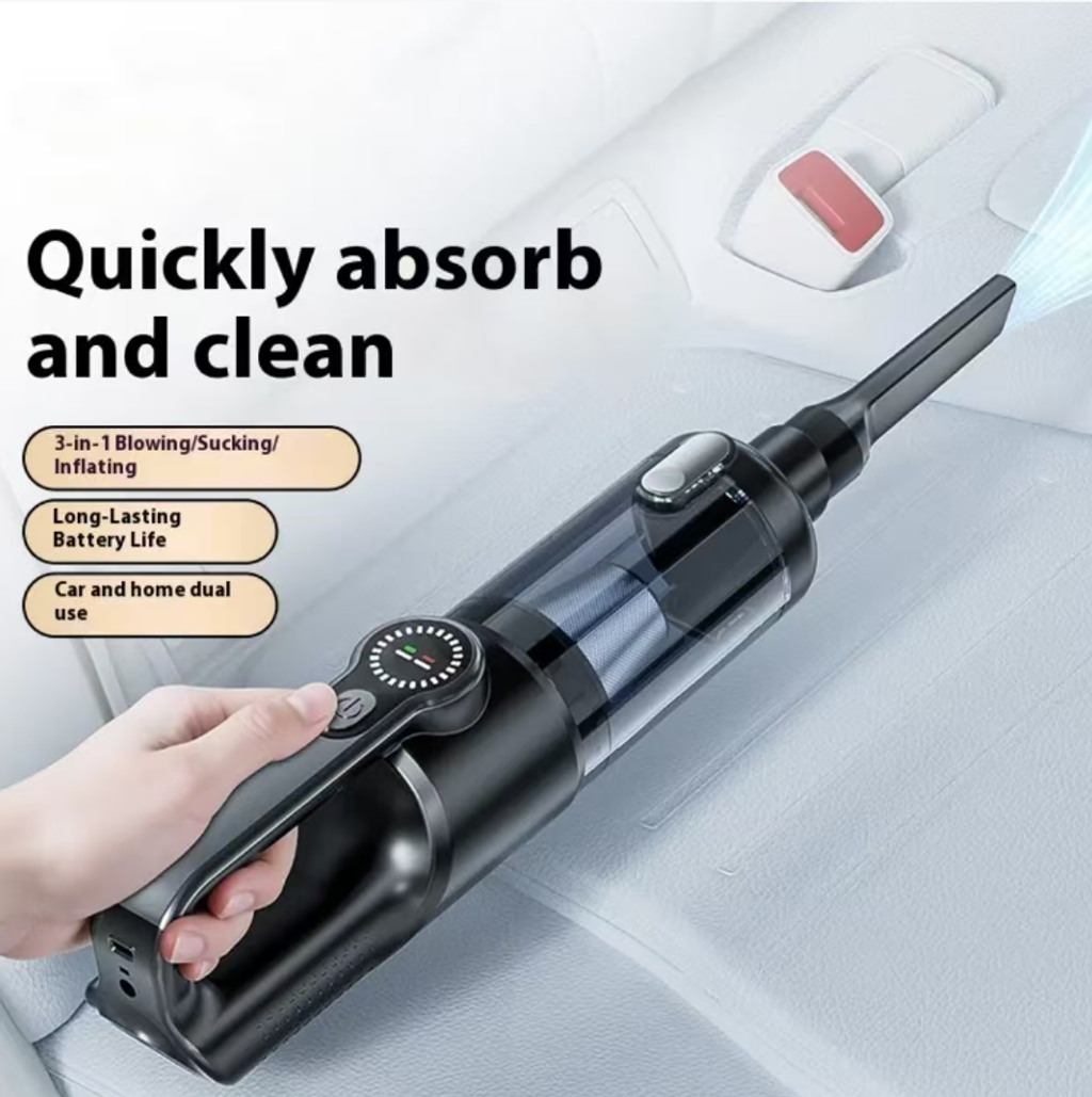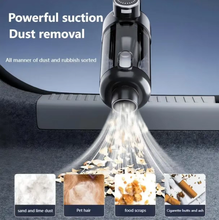 Wireless handheld and vehicle-mounted vacuum cleaner, with high power suction, capable of handling both dry and wet waste + combining suction and blowing functions. It can remove dust, debris, and wet garbage. With one-button dust discharge without dirtying hands, the filter can be washed and maintains long-lasting suction. The body is small and portable, ensuring no cleaning blind spots inside the vehicle. It is an essential cleaning tool for car owners.