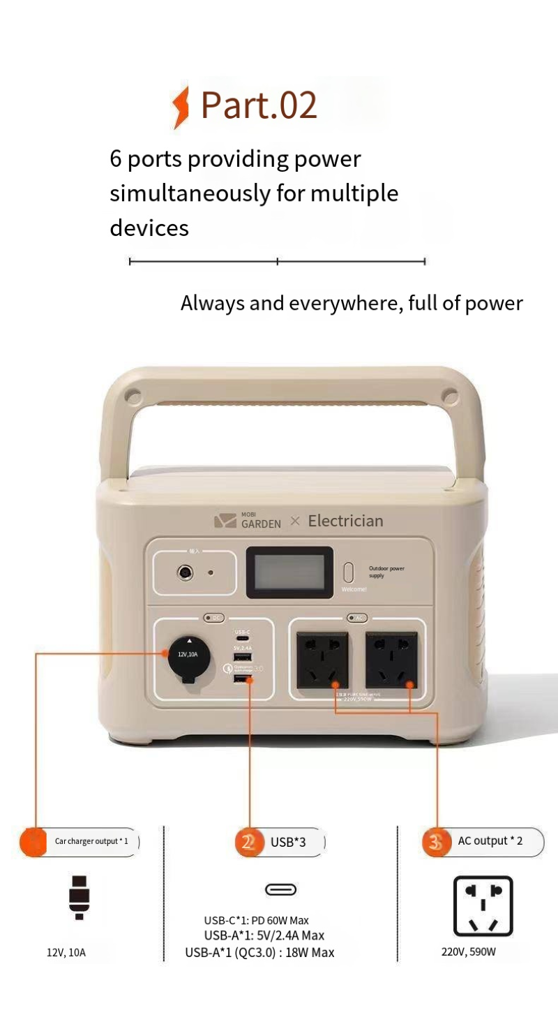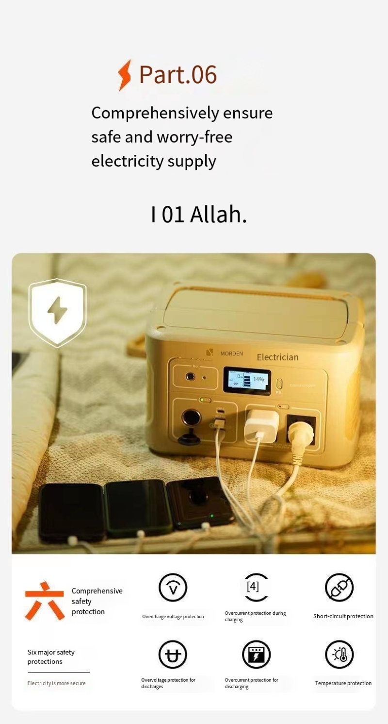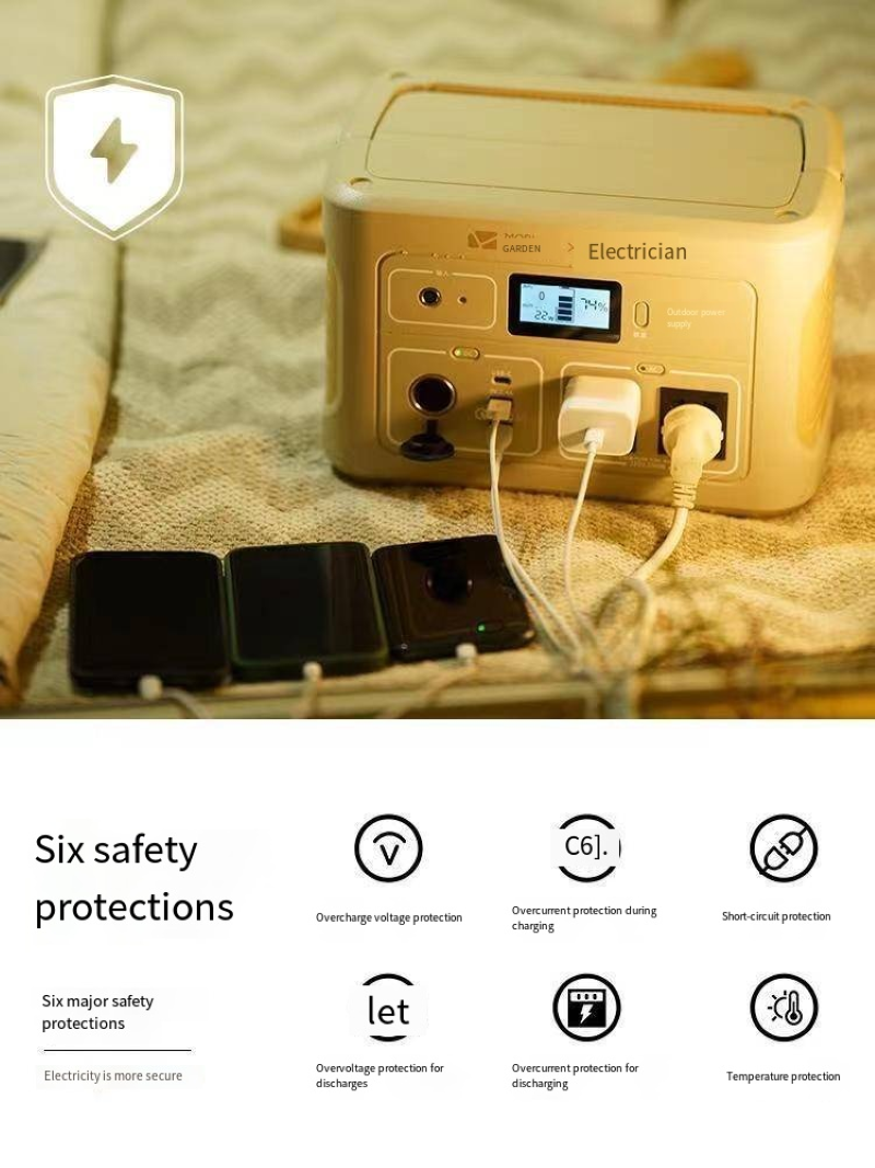 This 220V outdoor portable power bank features 600W high-power sinusoidal wave output technology, ensuring efficient and stable power supply. It is fully compatible with various digital devices and small appliances, making it safer to use. The large-capacity battery storage combined with lightweight and portable design enables it to easily handle diverse scenarios such as outdoor camping, long-distance driving, home power outage emergencies, and outdoor live streaming and vending. Multiple fast-charging interfaces allow for simultaneous power supply to devices like mobile phones, laptops, and car refrigerators, meeting the simultaneous power needs of multiple devices. It has multiple safety protections, operates silently without interference, and can provide long-lasting and stable power for both outdoor exploration to achieve electricity freedom and home emergency power supply in case of sudden power outages, making it practical and reassuring.