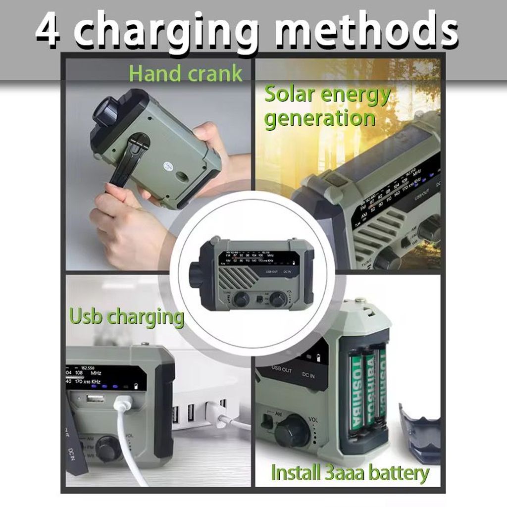 Multifunctional emergency disaster survival radio - hand-crank power generation - solar energy - USB 3AAA battery - 4 charging modes - strong light flashlight - adjustable reading lamp - SOS alarm call AM FM WB multi-band radio - outdoor camping - home power outage - earthquake disaster emergency must-have - portable and durable, capable of emergency charging for mobile phones, a portable safety guarantee device for emergencies.