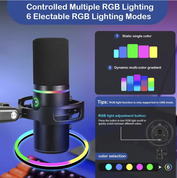 This dynamic microphone features a heart-shaped directional pickup that effectively blocks noise and delivers clear and full human voices. The RGB ambient light and physical knob provide convenient control. It is a two-in-one plug-and-play device, with a desktop stand that is stable and shock-resistant and comes with complete accessories. It is an essential audio recording tool for live streamers, audio recording and voice dubbing.
