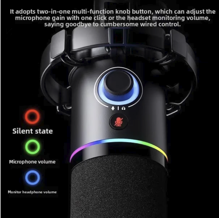 The body is equipped with an RGB colorful ambient light strip, with multi-color gradient effects, lighting up the live streaming atmosphere, and combining appearance level with strength. It is equipped with physical knobs and mute buttons, allowing for real-time volume adjustment, one-click mute to prevent accidental presses, and intuitive and convenient operation, making it easier to control the live broadcast, without frequent software switching.