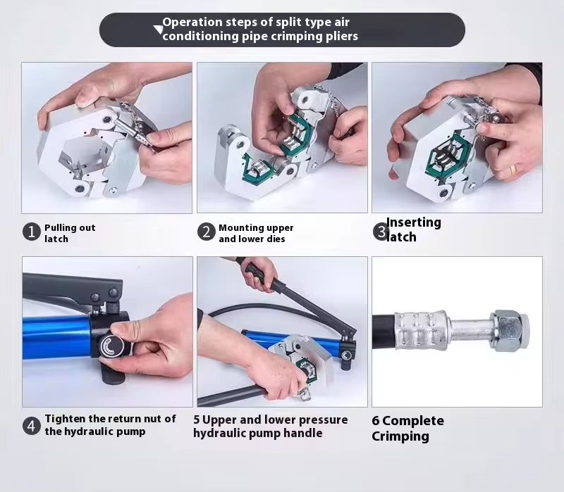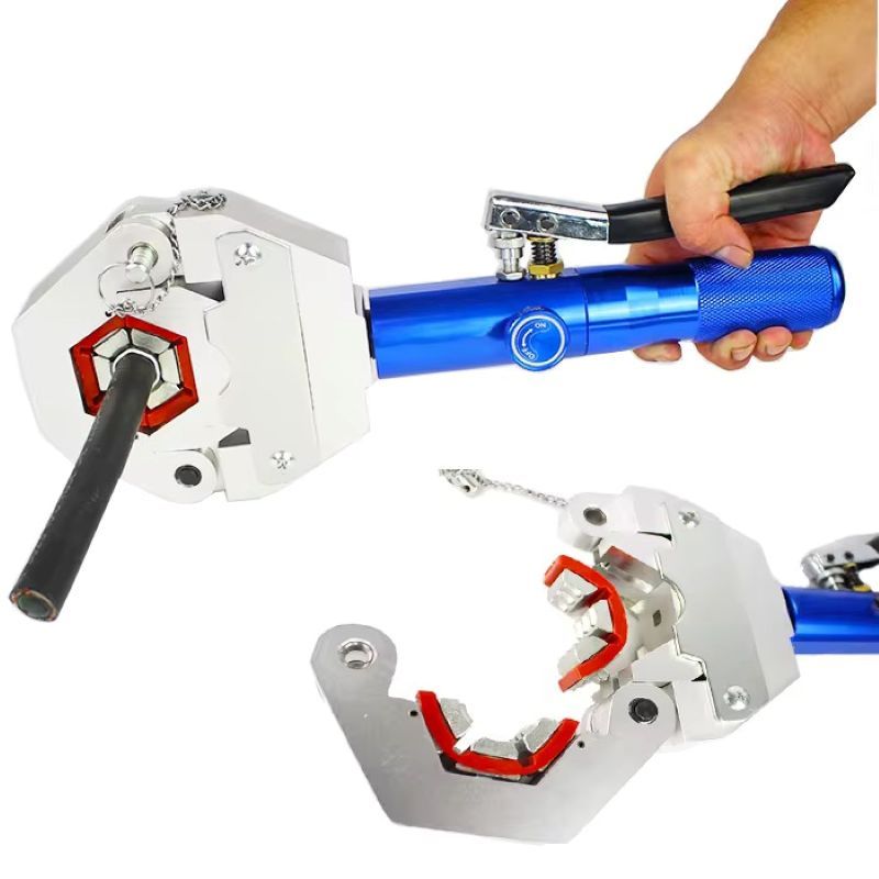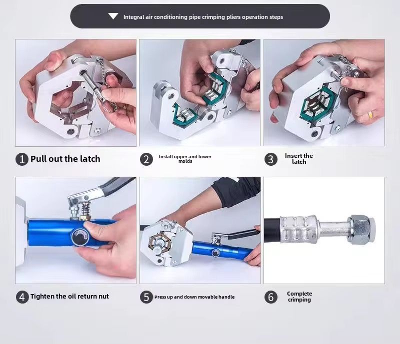 FS-7842 Integrated 8-ton Hydraulic Air Conditioning Pipe Pressing Wrench is specially designed for the maintenance of automotive air conditioning and refrigeration equipment piping. It is compatible with 3/8 - 7/8 inch hoses and comes with a complete set of multi-sized molds. The point-type hexagonal compression process ensures a firm joint seal. It is manually hydraulically driven, making operation effortless. The aluminum body is lightweight and durable, and the high-strength plastic box packaging makes it convenient to carry. It is an efficient working tool for refrigeration maintenance personnel.