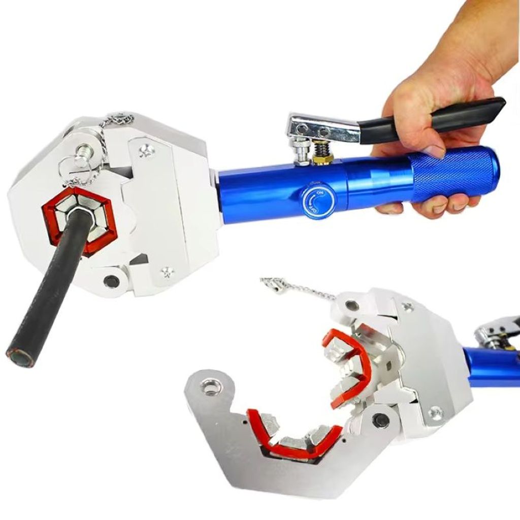 FS-7842 Integrated 8-ton Hydraulic Air Conditioning Pipe Pressing Wrench is a professional tool for repairing the piping of automotive air conditioning and refrigeration equipment. It is driven by manual hydraulic power, with an effective pressing stroke of 15mm, suitable for 3/8 - 7/8 inch air conditioning hoses. It is equipped with a complete set of 6SRB/6-8SRB/8/10SRB/10/12SRB/12 molds, and the point-type hexagonal compression process ensures a more secure joint seal.