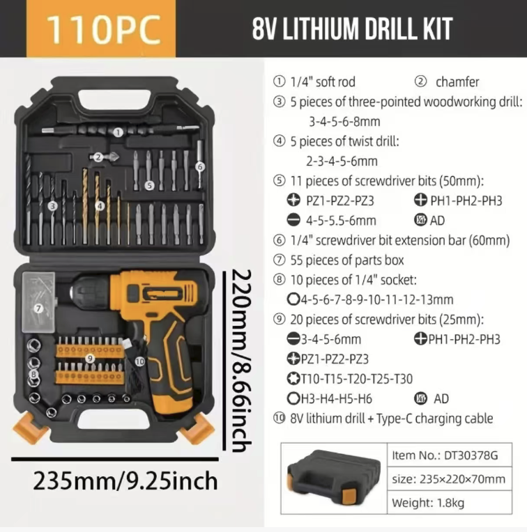 This 110-piece multi-functional radio drill set is equipped with an 8V motor that delivers 12N・m torque. It features an adjustable chuck ranging from 0 to 10mm, suitable for drilling various materials. The set includes all standard drill bits, screwdrivers and sockets. It supports Type-C fast charging and battery level display. The compact and portable design makes it an all-round choice for home repairs and DIY projects.
