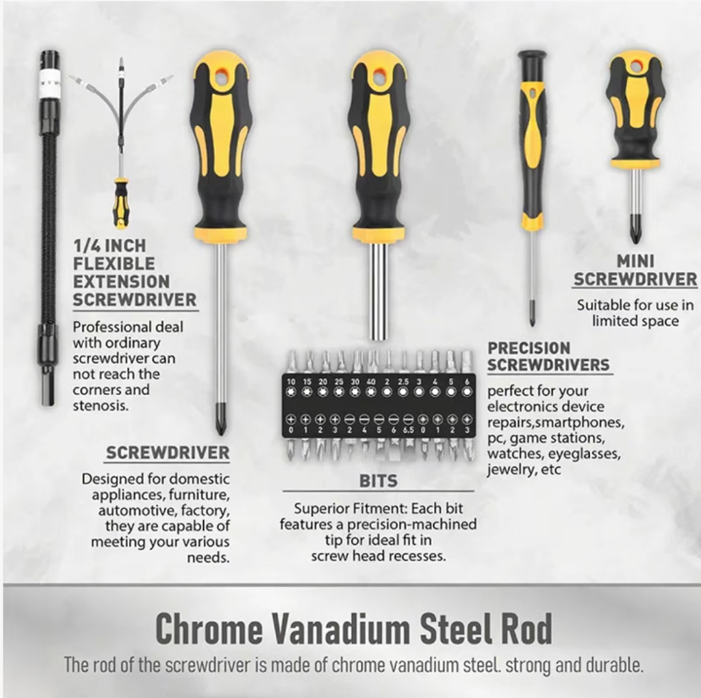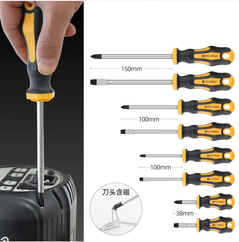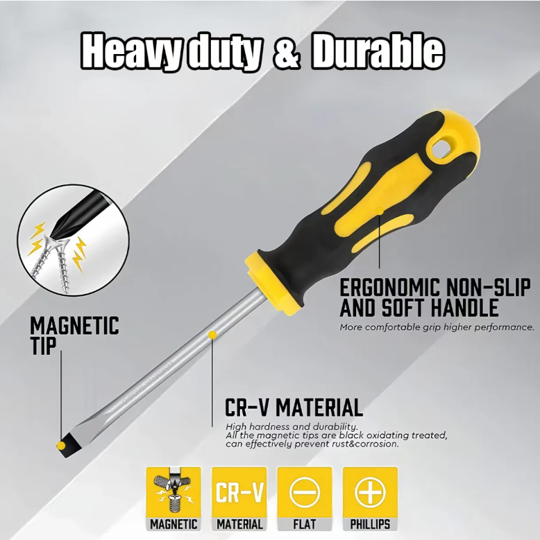 The screwdriver shafts are made of high-hardness chrome-vanadium steel and undergo heat treatment for enhanced strength and durability. They are resistant to impact and corrosion, maintaining their shape and not rusting over long-term use. The bits are wear-resistant and do not slip, offering a much longer service life than ordinary screwdrivers. It's a cost-effective and durable tool for both professional and home use.