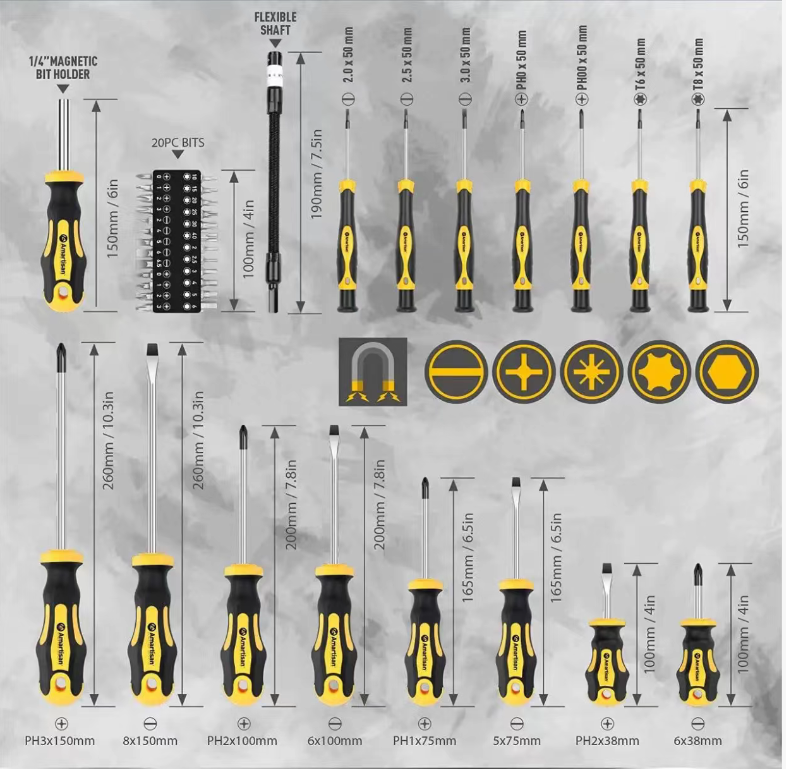 The set includes cross, flat, Phillips, and star-shaped screwdrivers, along with 20 precision bits, a 1/4" magnetic bit holder, a flexible shaft, and a magnetizer/demagnetizer, covering all screw assembly and disassembly needs for home use, auto repair, and electronic maintenance. One set covers all your repair needs without the need to purchase additional loose tools.