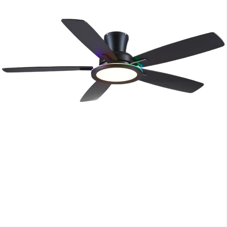 This 5-blade RGB intelligent ceiling fan lamp is equipped with a silent motor, providing gentle and quiet air circulation. It supports RGB full-color ambient lighting + three-color temperature main light, and can be controlled via remote control or through the APP. It offers two fan blades options: black and wood-grain. It is a popular home lighting and ventilation product that sells well across borders.