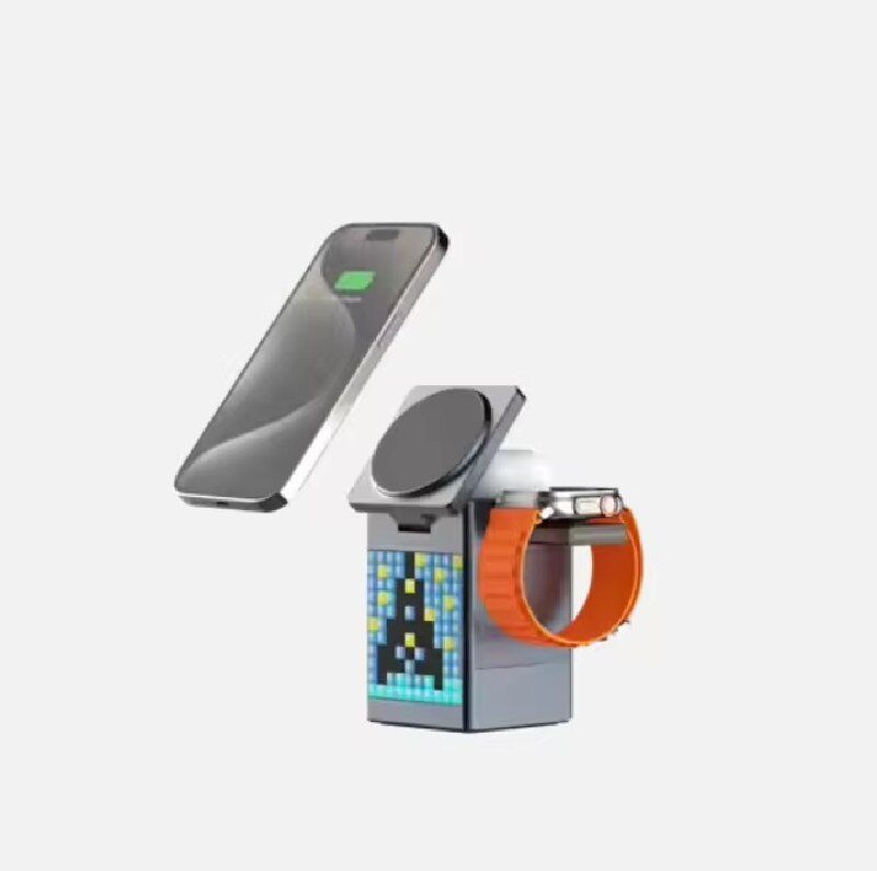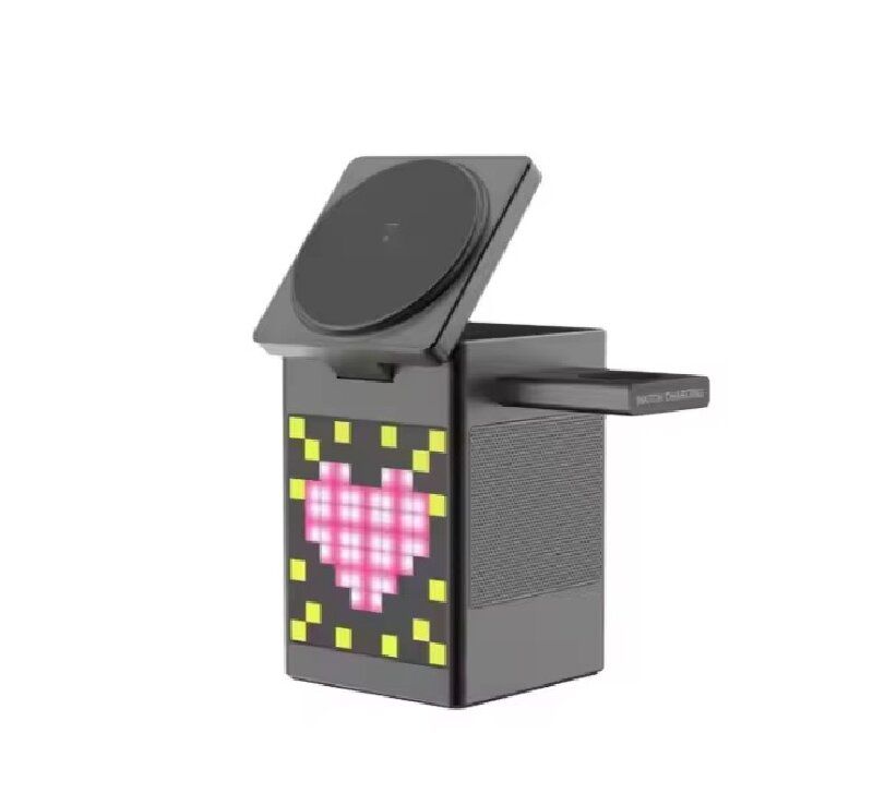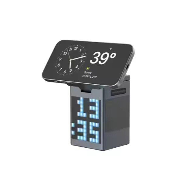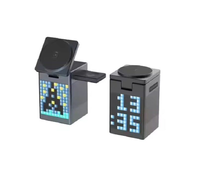 This 6-in-1 magnetic wireless charger integrates magnetic fast charging, pixel animation alarm clock, Bluetooth speaker, and night light functions. It can charge multiple devices simultaneously. It combines multiple functions on the desktop, making it neat and orderly. The pixel screen is full of fun. It is not only a great item for the office desktop but also a practical digital gadget for the bedroom bedside.
