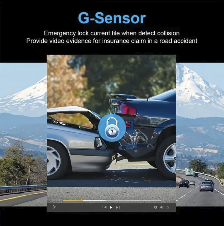 Built-in G-sensor gravity sensor, automatically locks the recording when a collision occurs, preventing the video from being overwritten; supports loop recording, seamlessly covers storage, without missing any part of the journey; motion detection function, parking monitoring is more convenient, automatic recording of vehicle movement, fully protecting vehicle safety.