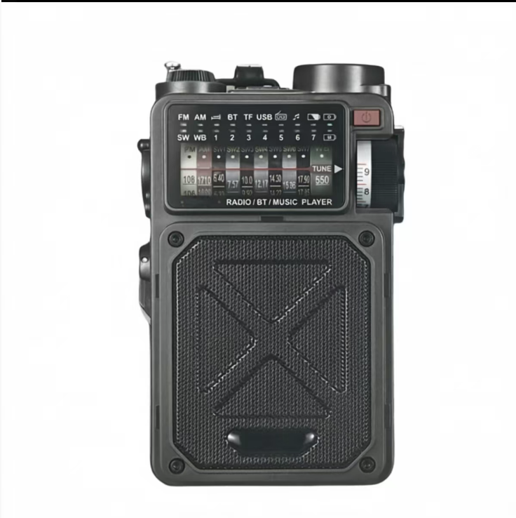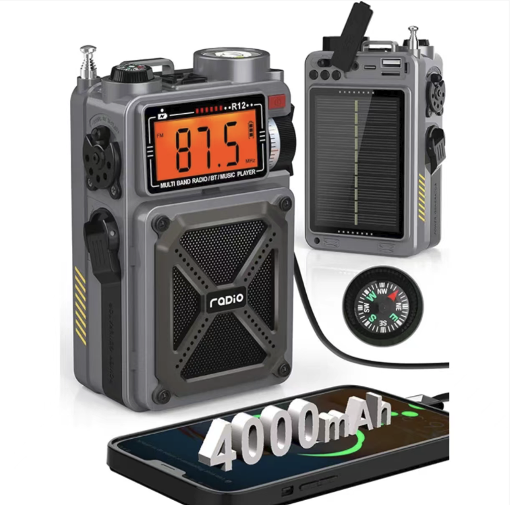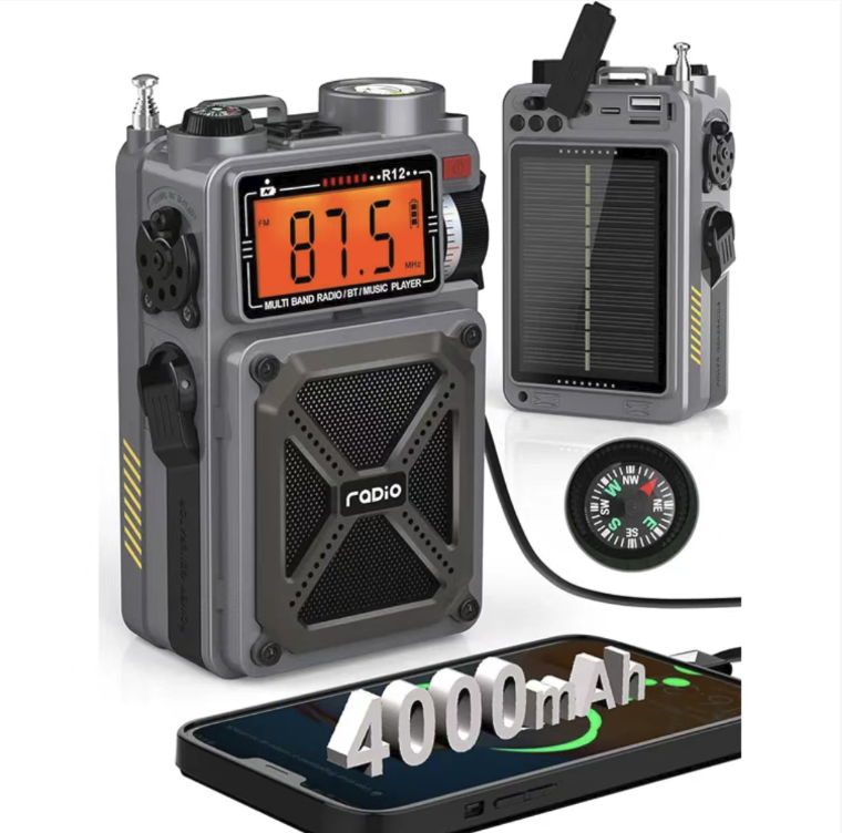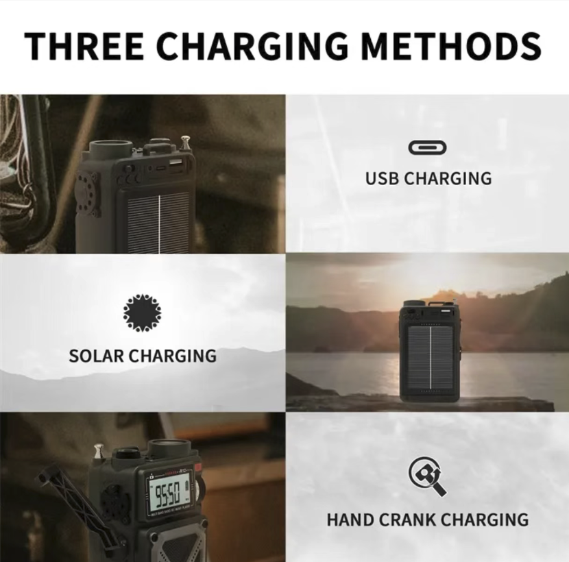 This disaster-prevention and emergency survival radio can receive emergency information across all frequency bands. It supports solar power, manual winding, and Type-C charging modes. With a 4000mAh large capacity, it can also function as a power bank. It comes with LED lighting, SOS distress signal, and compass functions. The military-grade triple protection body design makes it an all-in-one survival tool for family disaster prevention, outdoor exploration, and post-apocalyptic survival.