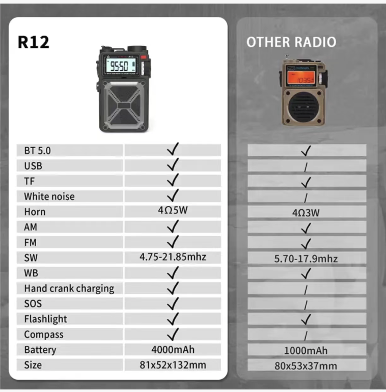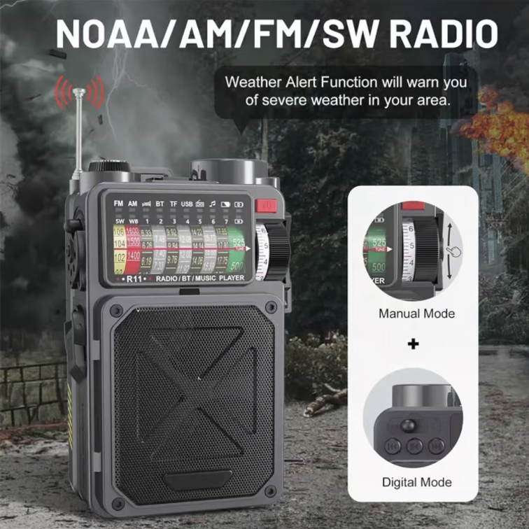 Support FM/AM/SW all-band radio reception, capable of receiving emergency broadcasts, weather warnings, and rescue information. Even in extreme disaster scenarios with no internet or power, it can receive real-time external updates, grasp rescue progress and survival guidelines, making it the "information lifeline" in disasters.
