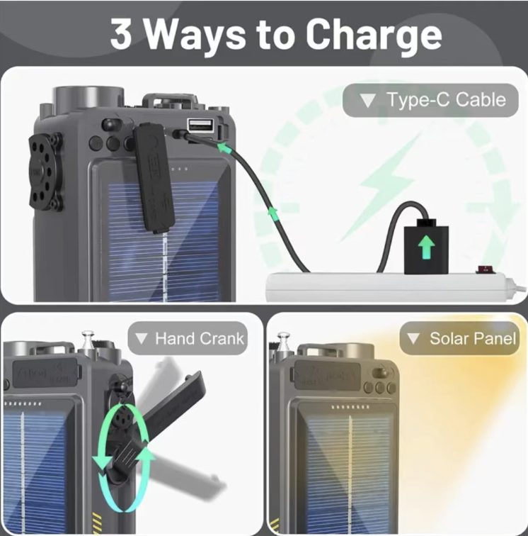 Equipped with a 4000mAh large-capacity lithium battery, it supports three power supply methods: solar charging, hand-crank power generation, and Type-C direct charging. It does not rely on mains electricity. With just one minute of hand-cranking, it can power up emergency. The solar panel continuously replenishes energy, enabling stable operation even in long-term power outages or outdoor powerless environments. Finally, it completely eliminates the worry of low battery.