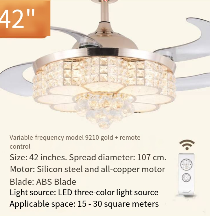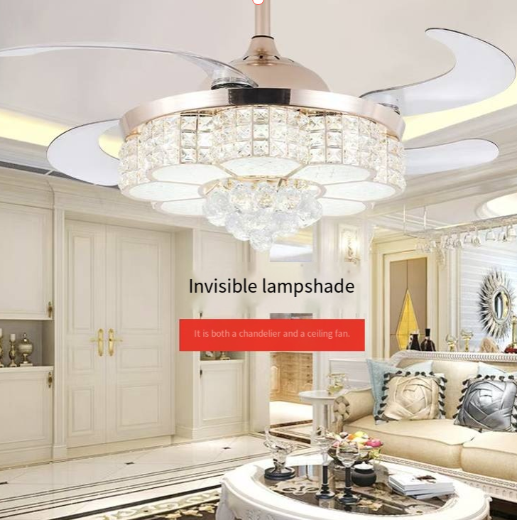 This European-style concealed inverter ceiling fan lamp features a luxurious crystal design, exuding an air of luxury. The inverter silent motor provides gentle air circulation. It has three-color LED dimming function with an endless range. The lamp and fan are integrated, saving space. The remote control operation is convenient. It is a high-end home item that combines lighting and air circulation for the living room, dining room, and bedroom.