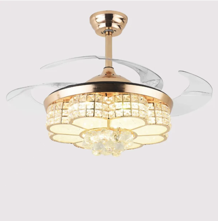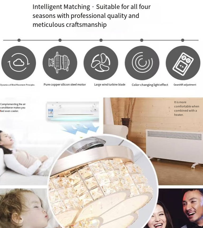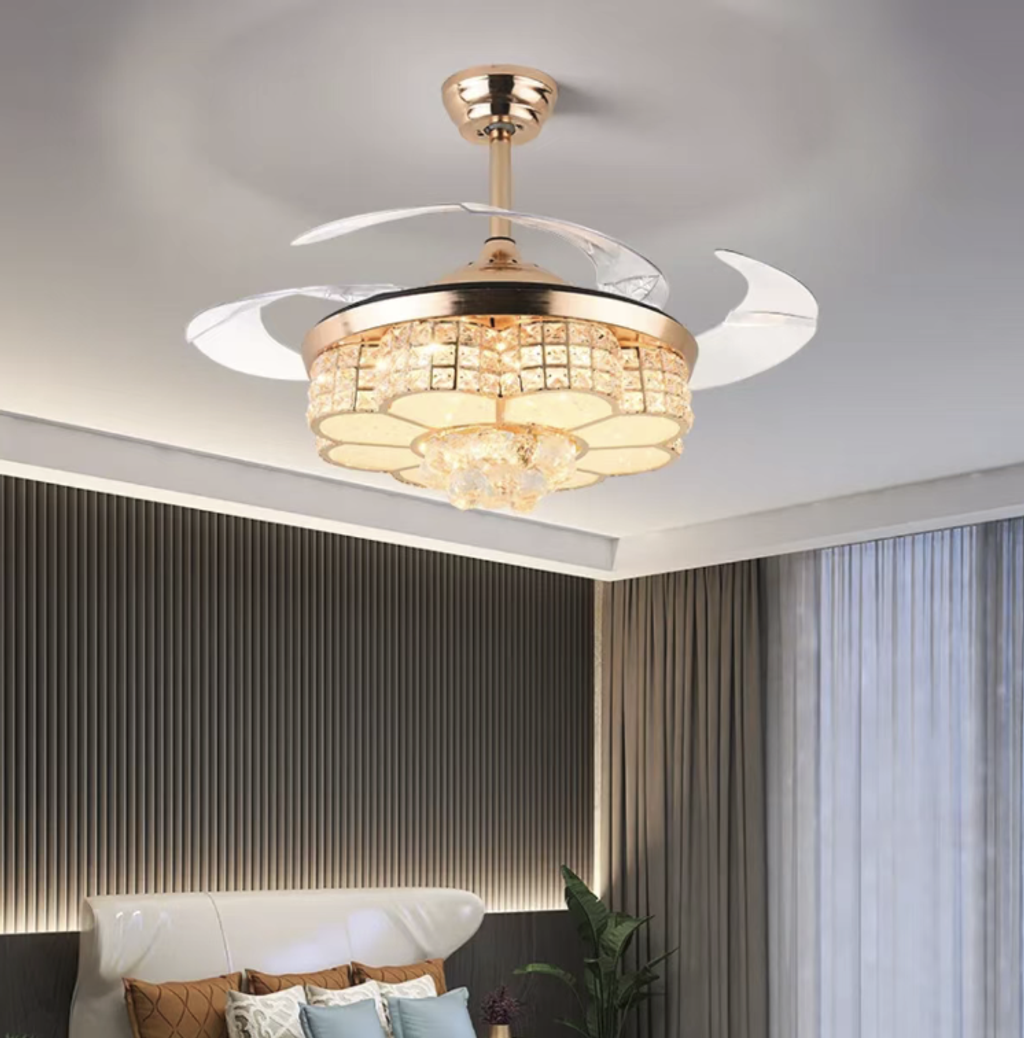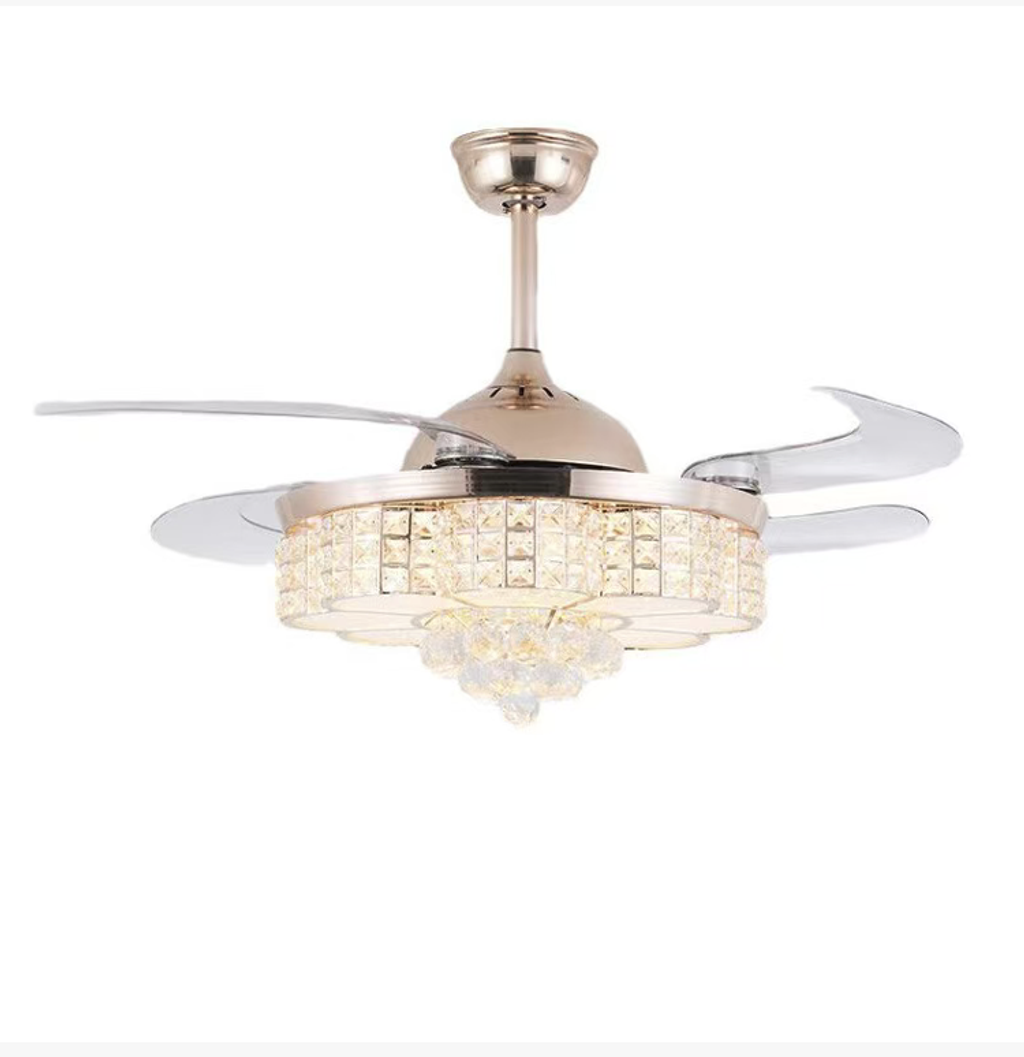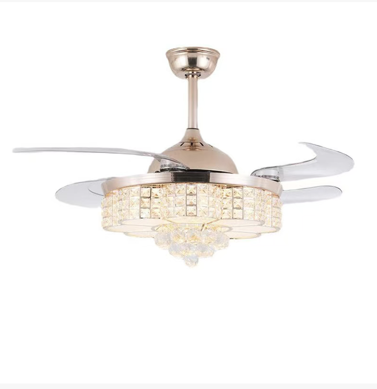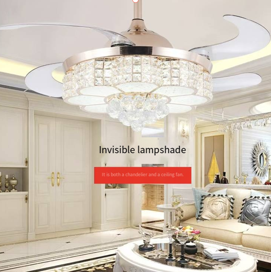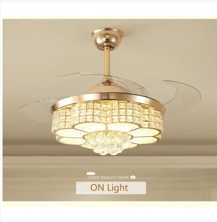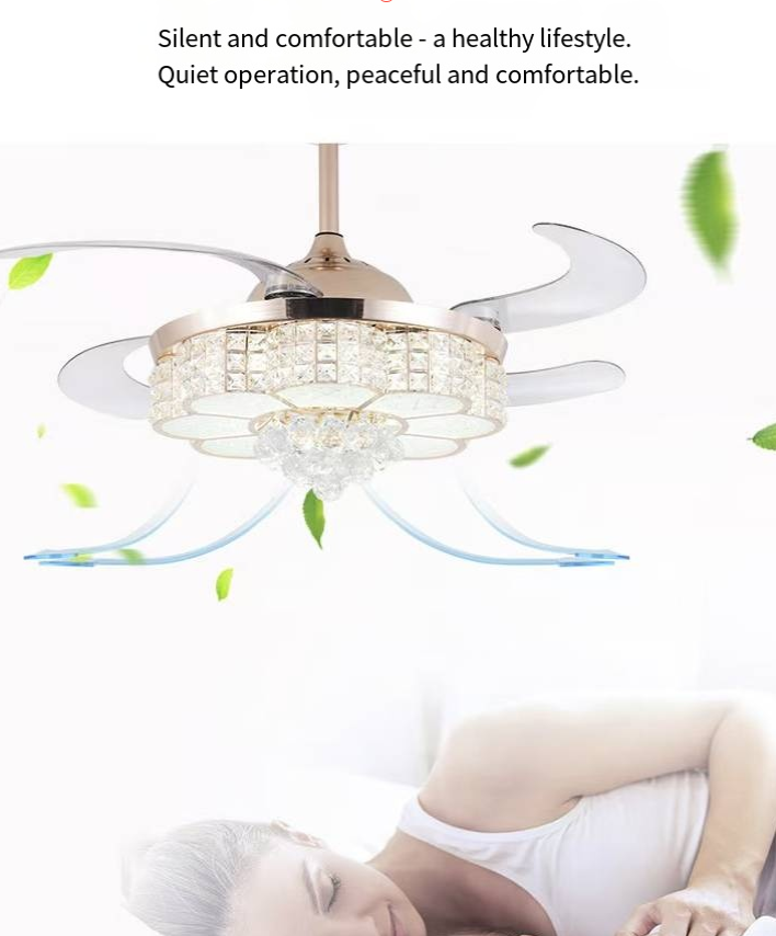 The lamp body adopts a luxurious crystal inlay technique, with multi-layer cut crystal lampshades and dazzling crystal pendants. When turned on, the light casts a flowing shadow, fully showcasing the European court luxury, perfectly matching various decoration styles such as European, luxurious, and American. The concealed transparent fan blade design opens slowly to send air and fully hides when closed, without disrupting the overall beauty of the chandelier. It is both a lighting fixture and a home decoration, enhancing the space's grade.