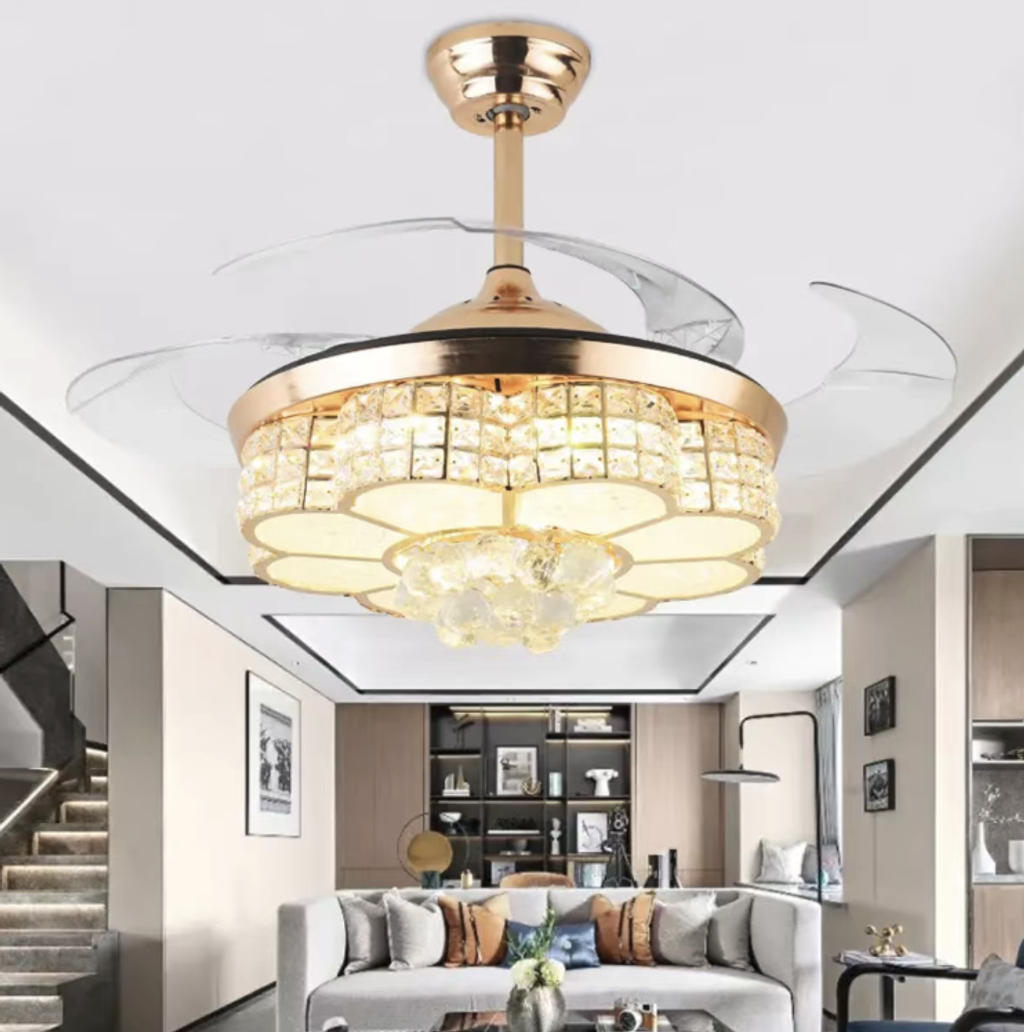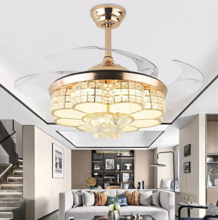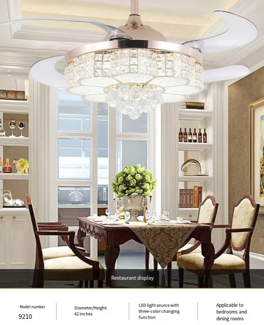 Are you still troubled by the space-consuming nature of traditional fans, the disordered appearance of separate light and fan units, and the insufficient air circulation of European-style chandeliers? This European-style concealed variable-frequency ceiling fan lamp integrates luxurious crystal design, concealed fan blades, variable-frequency silent operation, and three-color LED lighting. It is a one-stop ceiling installation solution for living rooms, dining rooms, and bedrooms, seamlessly blending European luxury with practical air circulation, creating a high-end and comfortable home environment.
