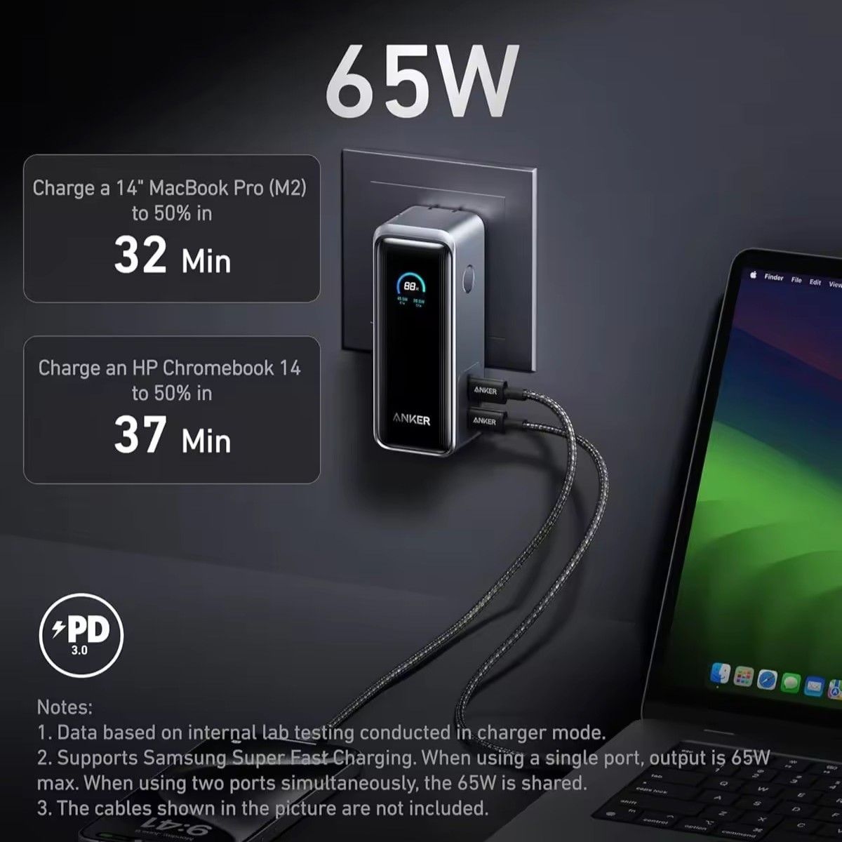 - Anker 65W Dual-Function Charger with Super Fast Charging Comes with Built-in Plug and Is Convenient and Portable