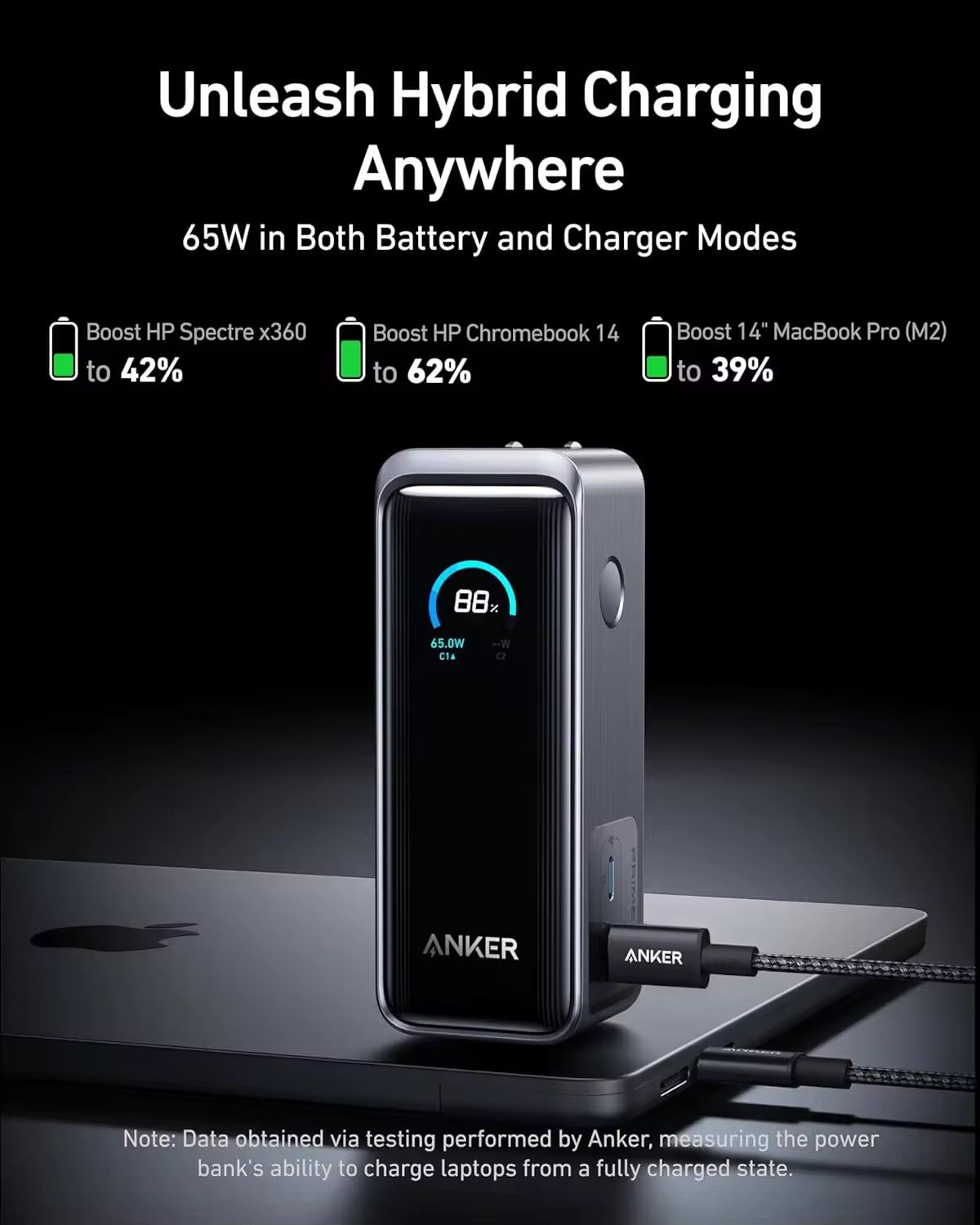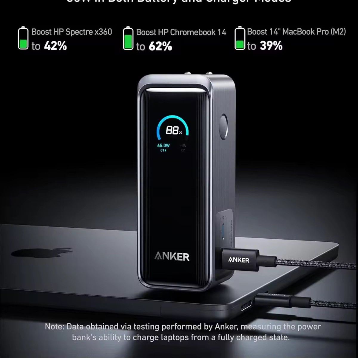 Are you still troubled by carrying a bunch of chargers and power banks for business trips, with bulky luggage, slow charging, and insufficient sockets? This Anker 65W two-in-one super fast charging power bank integrates a 65W gallium nitride fast charging head, a large-capacity power bank, a digital display screen, and multiple output ports. It truly achieves "one is equivalent to N", serving as an all-round power solution for business trips, commutes, and office work, completely reducing the burden of travel.