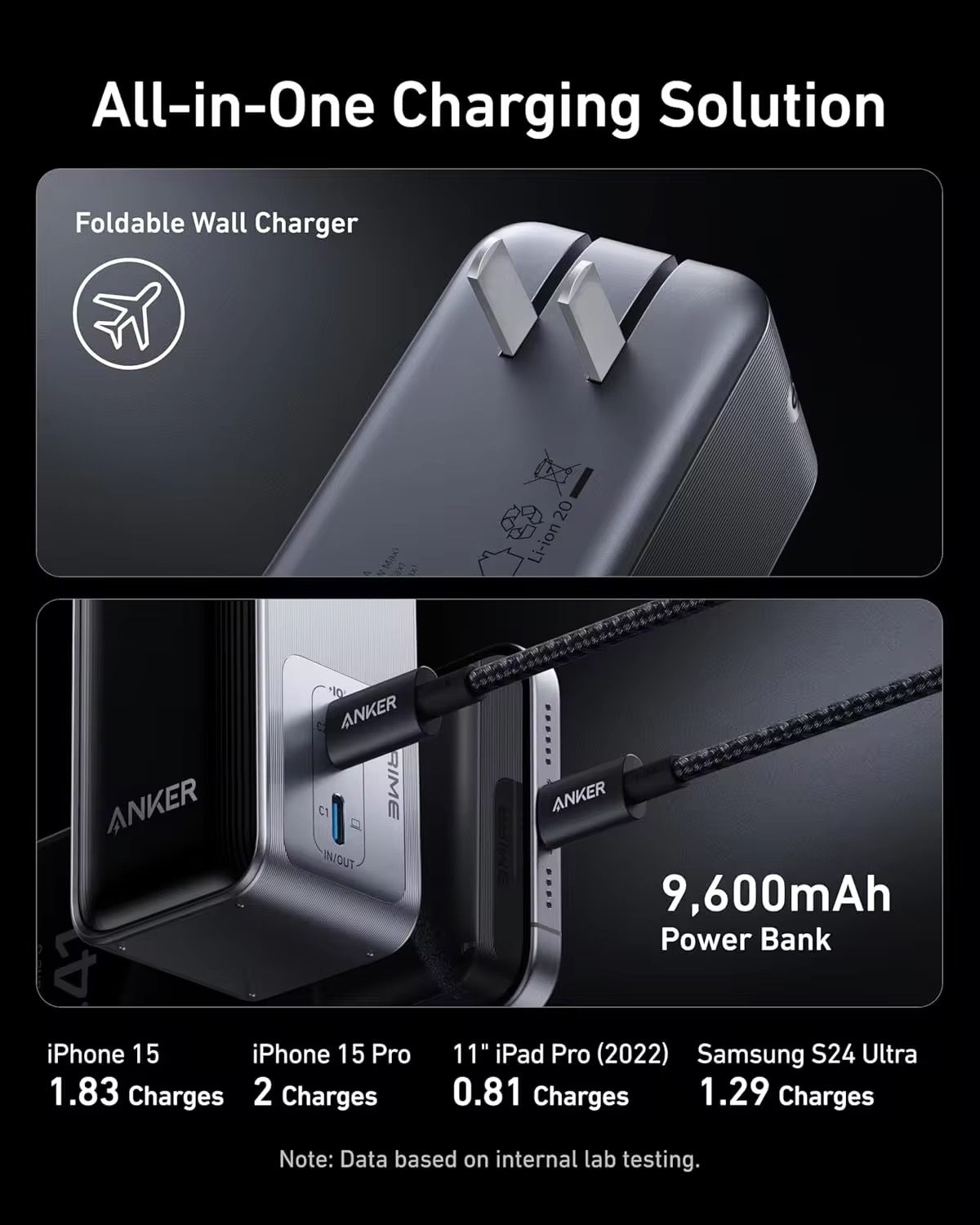 This is Anker's dual-purpose portable charger. It comes with a built-in plug and a digital display screen. It has a capacity of 9600mAh and supports 65W fast charging. It can charge mobile phones and laptops. Its size is 60% smaller than the traditional 65W portable charger. The folding plug is portable, and it can supply power to two devices simultaneously. It can handle all your charging needs during business trips or travels.