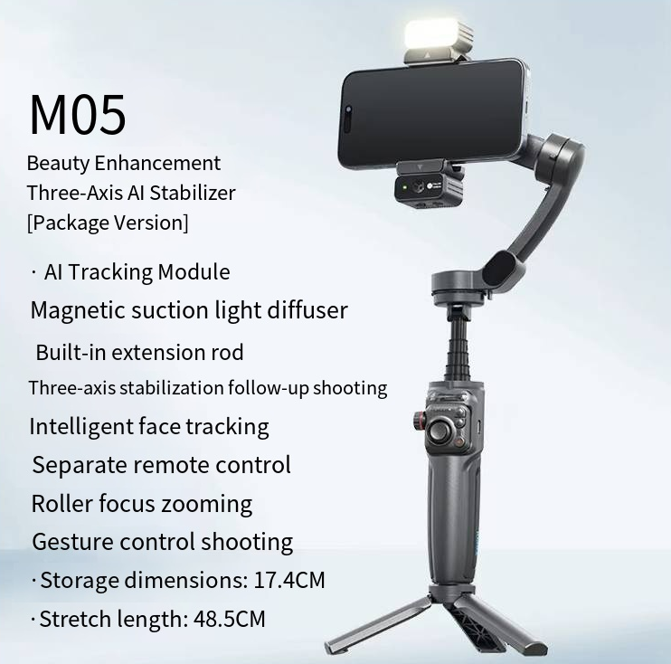 Are you still troubled by shaky camera shots, inaccurate follow-up, and insufficient lighting? This M05 three-axis AI mobile gimbal stabilizer integrates three-axis stabilization, AI intelligent follow-up, extendable lighting, and multiple operation modes. It is an all-round shooting assistant for Vlog creation, live streaming promotion, and travel recording, ensuring every video is stable, clear, and beautiful.