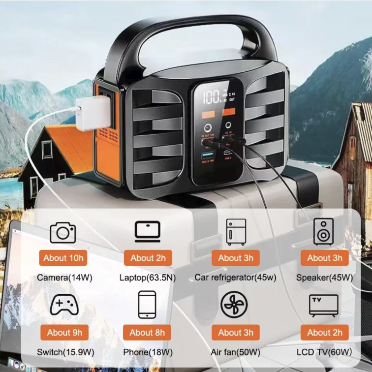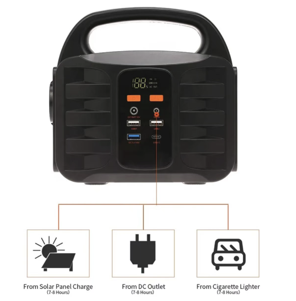 Equipped with AC national standard five-hole sockets, DC 12V output, dual USB-A ports, Type-C port + QC3.0 fast charging port. It can simultaneously power multiple devices such as mobile phones, computers, cameras, rice cookers, projectors, and car refrigerators. This single power supply can meet all power needs, and it can be easily adapted for outdoor camping, self-driving trips, and family emergencies.