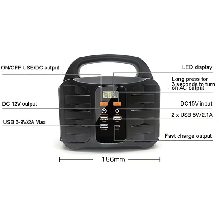 This outdoor portable energy storage power supply features multiple interfaces for all-round output, intelligent digital display to show real-time power level. It has a large-capacity battery cell for long-lasting power supply. The portable handle makes it easy to carry. It also has multiple safety protections. It is an all-round mobile power station for outdoor camping, self-driving trips, and family emergencies.