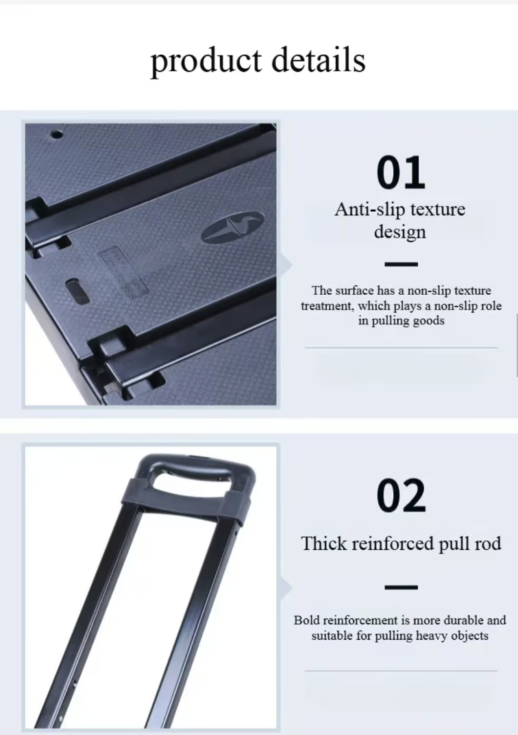 This portable trolley is specially designed for daily transportation. It has excellent load-bearing capacity, is quiet and durable, and moves smoothly without disturbing neighbors. With its quiet load-bearing, portable and foldable design, it is suitable for supermarket shopping, courier pickup and outdoor travel. It can be used for multiple purposes, making the transportation process effortless and worry-free. It makes carrying things a breeze and less tiring.
