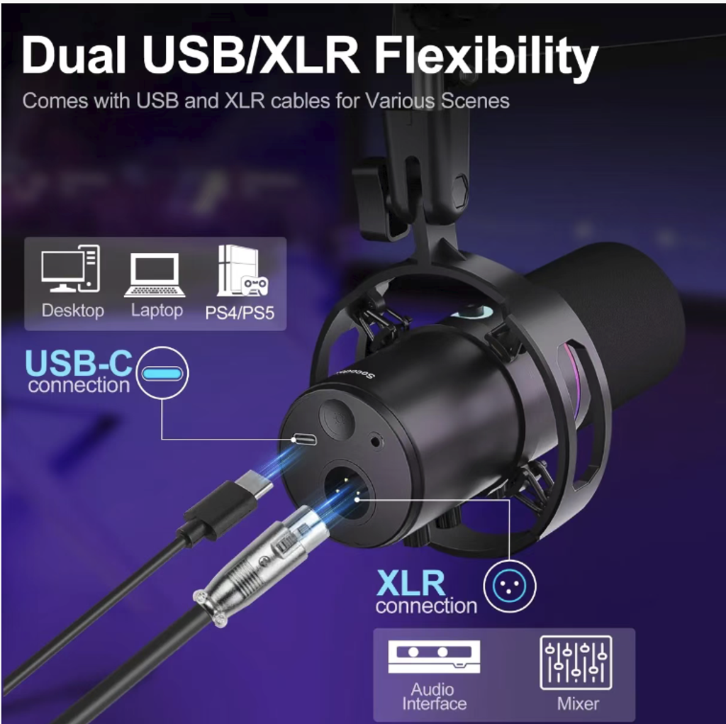 It comes with a Type-C/USB dual-purpose connection cable, eliminating the need for drivers or sound cards. It is plug-and-play and compatible with desktop computers, laptops, and mobile phones. It is also compatible with mainstream live streaming, recording, and gaming voice software, making it easy for beginners to get started. Open the box and start using it immediately, without the need for complex setup, making live streaming and gaming accessible to everyone.