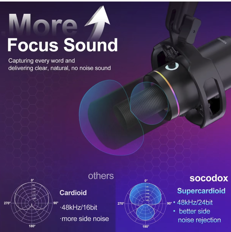 Equipped with a high-quality dynamic microphone capsule, it features a cardioid polar pattern for precise voice capture. It effectively blocks out environmental noise, keyboard sounds, echoes, and electrical interference, ensuring clear and clean vocals even in a desktop setting. Whether for live streaming, e-sports, voiceovers, or recording, it delivers full and transparent sound quality, eliminating noisy background noise and making your voice more engaging.