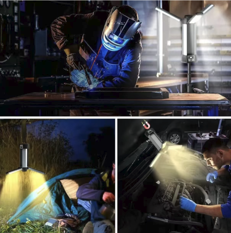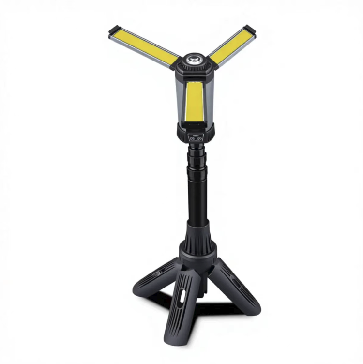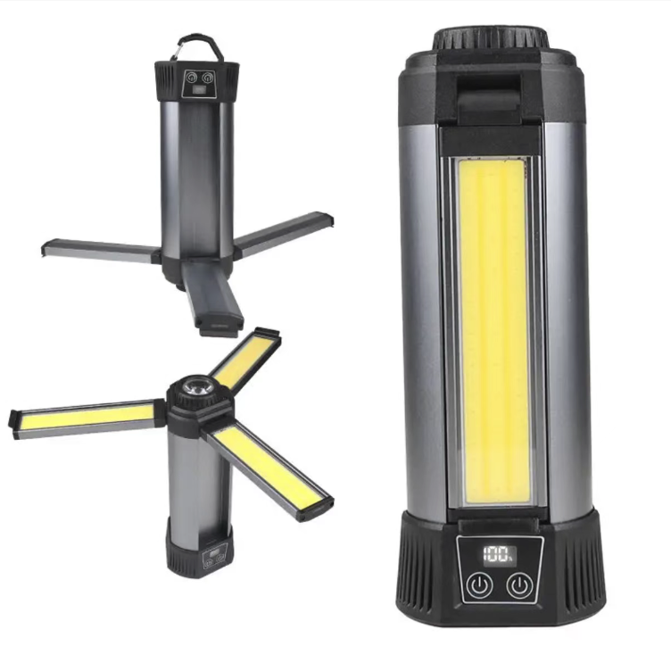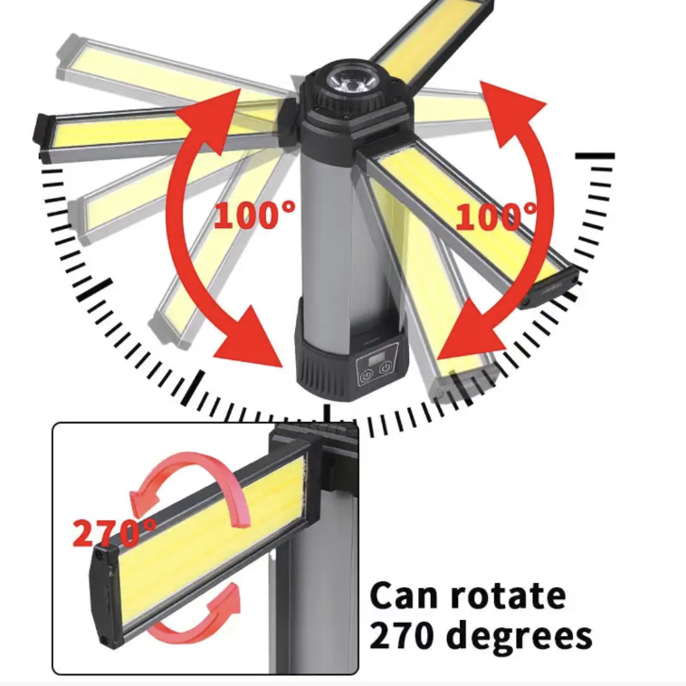 This stretchable COB work light features high-brightness COB lamp beads with a wide floodlight without blind spots. The three lamp heads can open and close at 90°, and the extendable tripod allows for free height adjustment. It supports multi-level dimming, fast charging and long battery life. It also has magnetic attraction and power bank functions, is durable and robust, making it an all-round lighting wonder for outdoor camping, engineering work and emergency lighting.