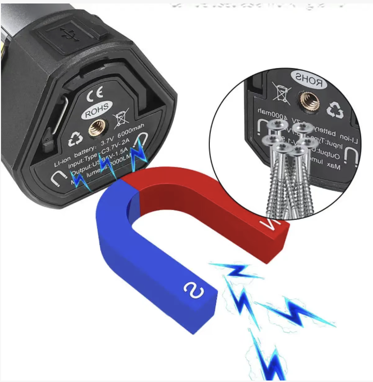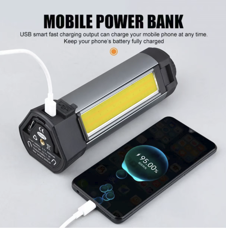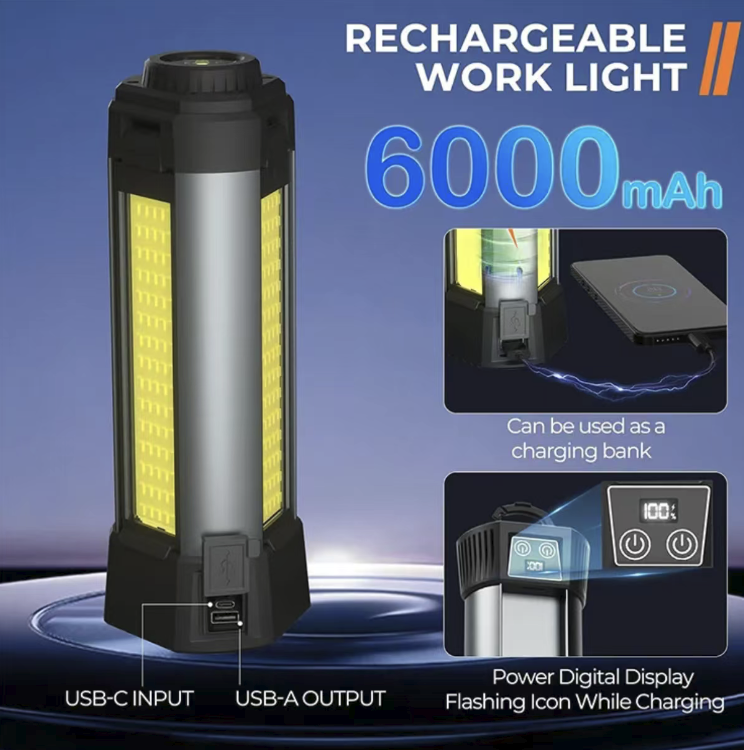 It is equipped with a large-capacity lithium battery that supports Type-C fast charging and has a long battery life. It has a power bank function that can be used to charge mobile phones and other devices in emergencies. The bottom has a strong magnetic design that can be attached to metal surfaces, freeing your hands for work. It supports multi-level dimming and dual-color temperature adjustment, suitable for camping, work, emergency and auto repair scenarios.